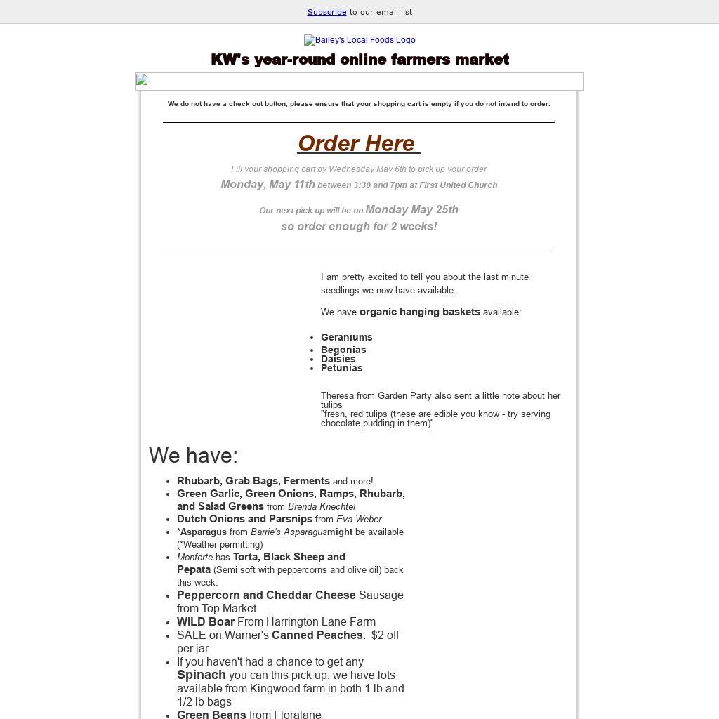 | We do not have a check out button, please ensure that your shopping cart is empty if you do not intend to order. Order Here Fill your shopping cart by Wednesday May 6th to pick up your order