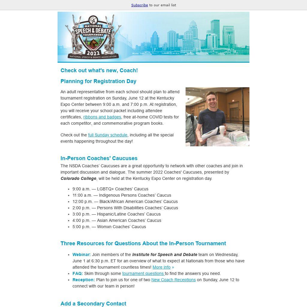 The NSDA Coaches’ Caucuses are a great opportunity to network with other coaches and join in important discussion and dialogue. The summer 2022 Coaches' Caucuses, presented by Colorado College, will be held at the Kentucky Expo Center on registration day.