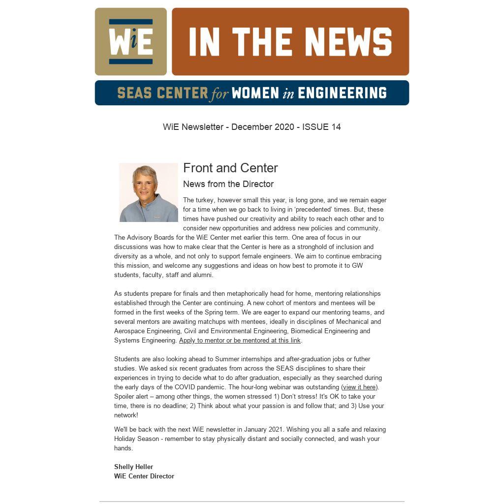The turkey, however small this year, is long gone, and we remain eager for a time when we go back to living in ‘precedented’ times. But, these times have pushed our creativity and ability to reach each other and to consider new opportunities and address new policies and community. The Advisory Boards for the WiE Center met earlier this term. One area of focus in our discussions was how to make clear that the Center is here as a stronghold of inclusion and diversity as a whole, and not only to support female engineers. We aim to continue embracing this mission, and welcome any suggestions and ideas on how best to promote it to GW students, faculty, staff and alumni.