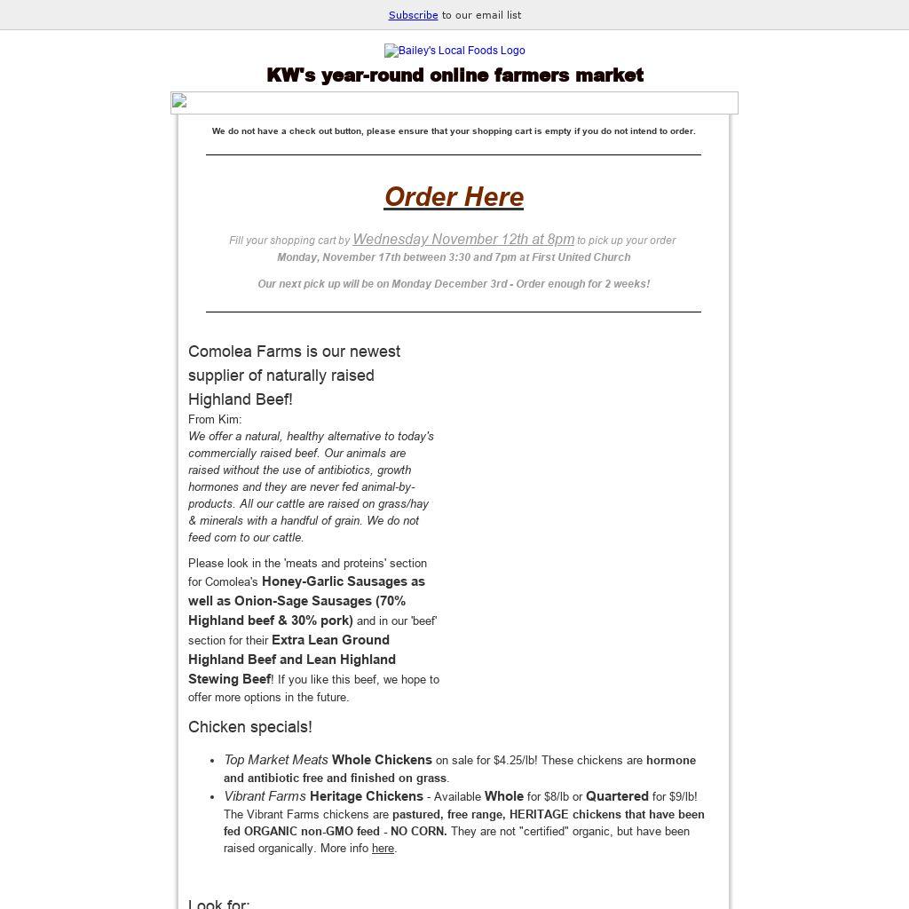 Please look in the 'meats and proteins' section for Comolea's Honey-Garlic Sausages as well as Onion-Sage Sausages (70% Highland beef & 30% pork) and in our 'beef' section for their Extra Lean Ground Highland Beef and Lean Highland Stewing Beef! If you like this beef, we hope to offer more options in the future.
