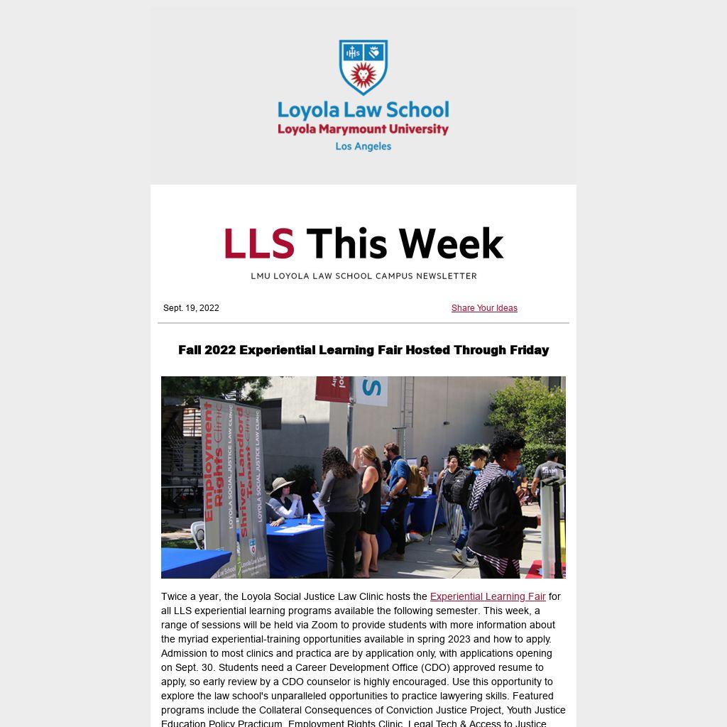 Twice a year, the Loyola Social Justice Law Clinic hosts the Experiential Learning Fair for all LLS experiential learning programs available the following semester. This week, a range of sessions will be held via Zoom to provide students with more information about the myriad experiential-training opportunities available in spring 2023 and how to apply. Admission to most clinics and practica are by application only, with applications opening on Sept. 30. Students need a Career Development Office (CDO) approved resume to apply, so early review by a CDO counselor is highly encouraged. Use this opportunity to explore the law school's unparalleled opportunities to practice lawyering skills. Featured programs include the Collateral Consequences of Conviction Justice Project, Youth Justice Education Policy Practicum, Employment Rights Clinic, Legal Tech & Access to Justice Practicum, Loyola Center for Conflict Resolution, Loyola Genocide Justice Clinic, Poehls/Hobbs DA Practicum, Field Placements, RISE Clinic, Shriver Landlord-Tenant Clinic, Entertainment Law Practicum, Federal Public Defender Death Penalty Clinic, Transactional Lawyering Team, Consumer Bankruptcy Clinic, Sales/Use Tax Clinic, and the State Income Tax Clinic. Schedule & more>>