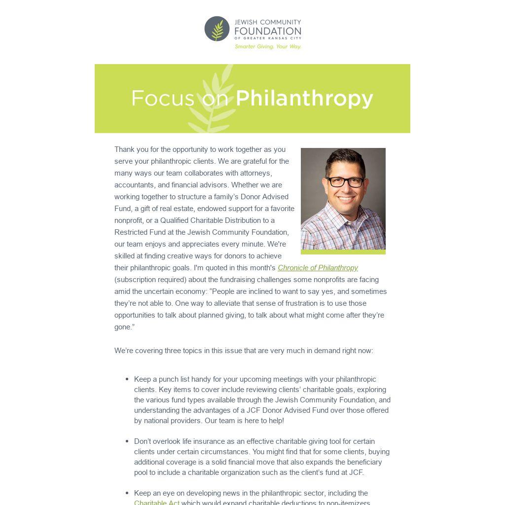 The team at the Jewish Community Foundation is a resource and sounding board as you serve your philanthropic clients. We understand the charitable side of the equation and are happy to serve as a secondary source as you manage the primary relationship with your clients. This newsletter is provided for informational purposes only. It is not intended as legal, accounting, or financial planning advice.