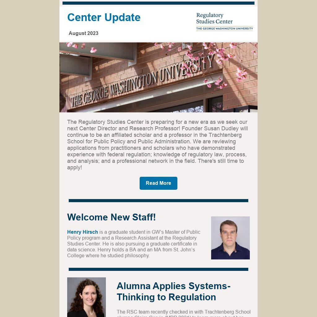The Regulatory Studies Center is preparing for a new era as we seek our next Center Director and Research Professor! Founder Susan Dudley will continue to be an affiliated scholar and a professor in the Trachtenberg School for Public Policy and Public Administration. We are reviewing applications from practitioners and scholars who have demonstrated experience with federal regulation; knowledge of regulatory law, process, and analysis; and a professional network in the field. There's still time to apply!
