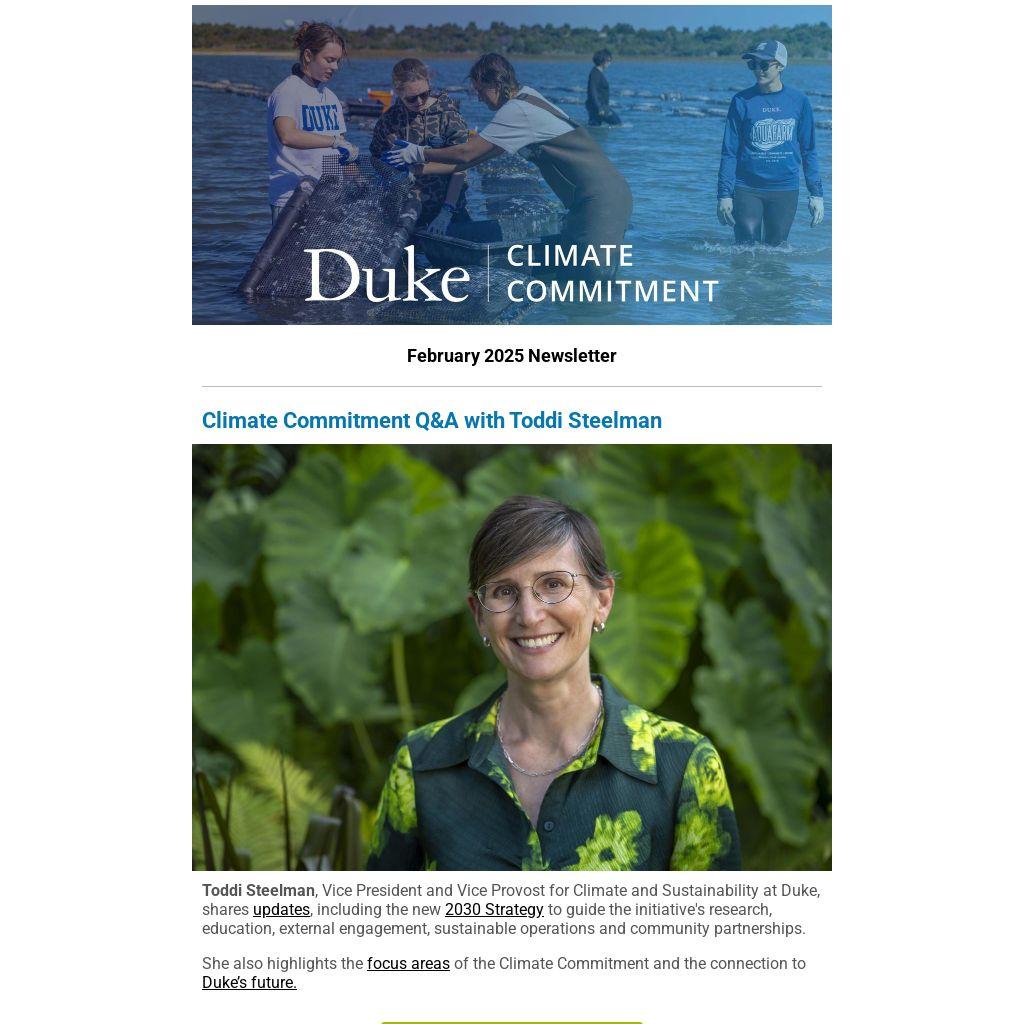 Toddi Steelman, Vice President and Vice Provost for Climate and Sustainability at Duke, shares updates, including the new 2030 Strategy to guide the initiative's research, education, external engagement, sustainable operations and community partnerships.