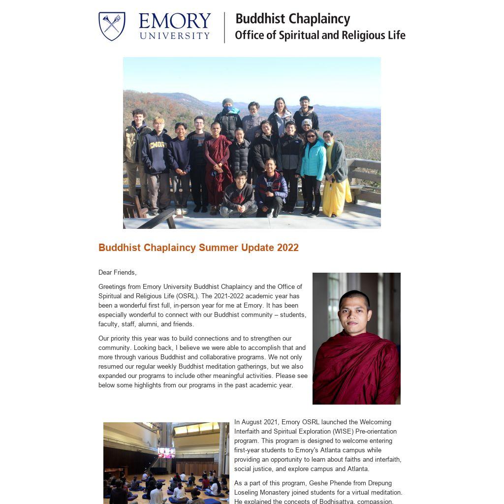 Buddhist teachers from Emory University and greater Atlanta continued facilitating our weekly Buddhist meditation gatherings on Thursdays at 6:00 p.m. throughout the year in Cannon Chapel. On average, the gatherings had about 25-30 participants.