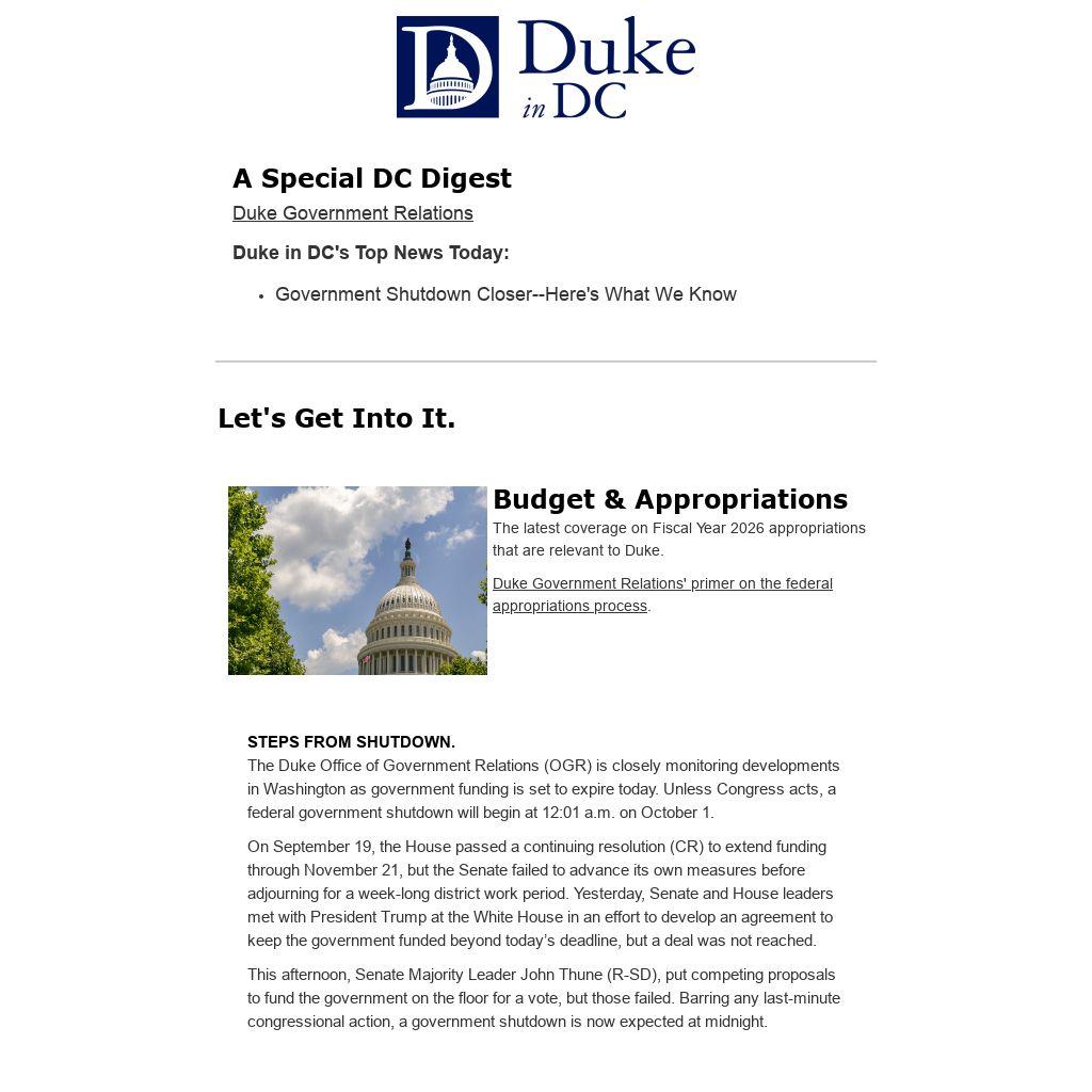 The Duke Office of Government Relations (OGR) is closely monitoring developments in Washington as government funding is set to expire today. Unless Congress acts, a federal government shutdown will begin at 12:01 a.m. on October 1.