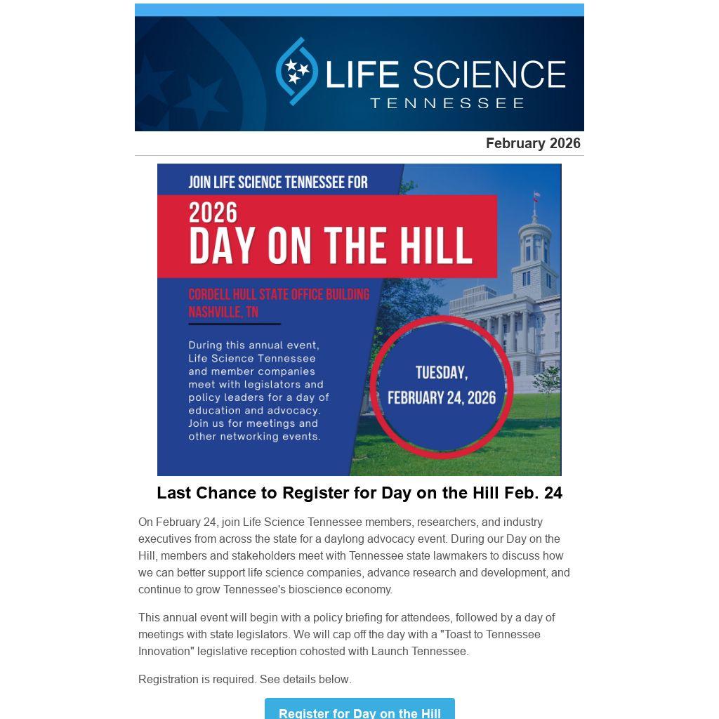On February 24, join Life Science Tennessee members, researchers, and industry executives from across the state for a daylong advocacy event. During our Day on the Hill, members and stakeholders meet with Tennessee state lawmakers to discuss how we can better support life science companies, advance research and development, and continue to grow Tennessee's bioscience economy.