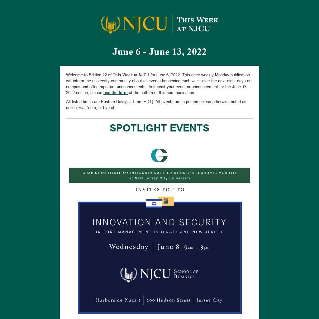 Welcome to Edition 22 of This Week at NJCU for June 6, 2022. This once-weekly Monday publication will inform the university community about all events happening each week over the next eight days on campus and offer important announcements. To submit your event or announcement for the June 13, 2022 edition, please use the form at the bottom of this communication.