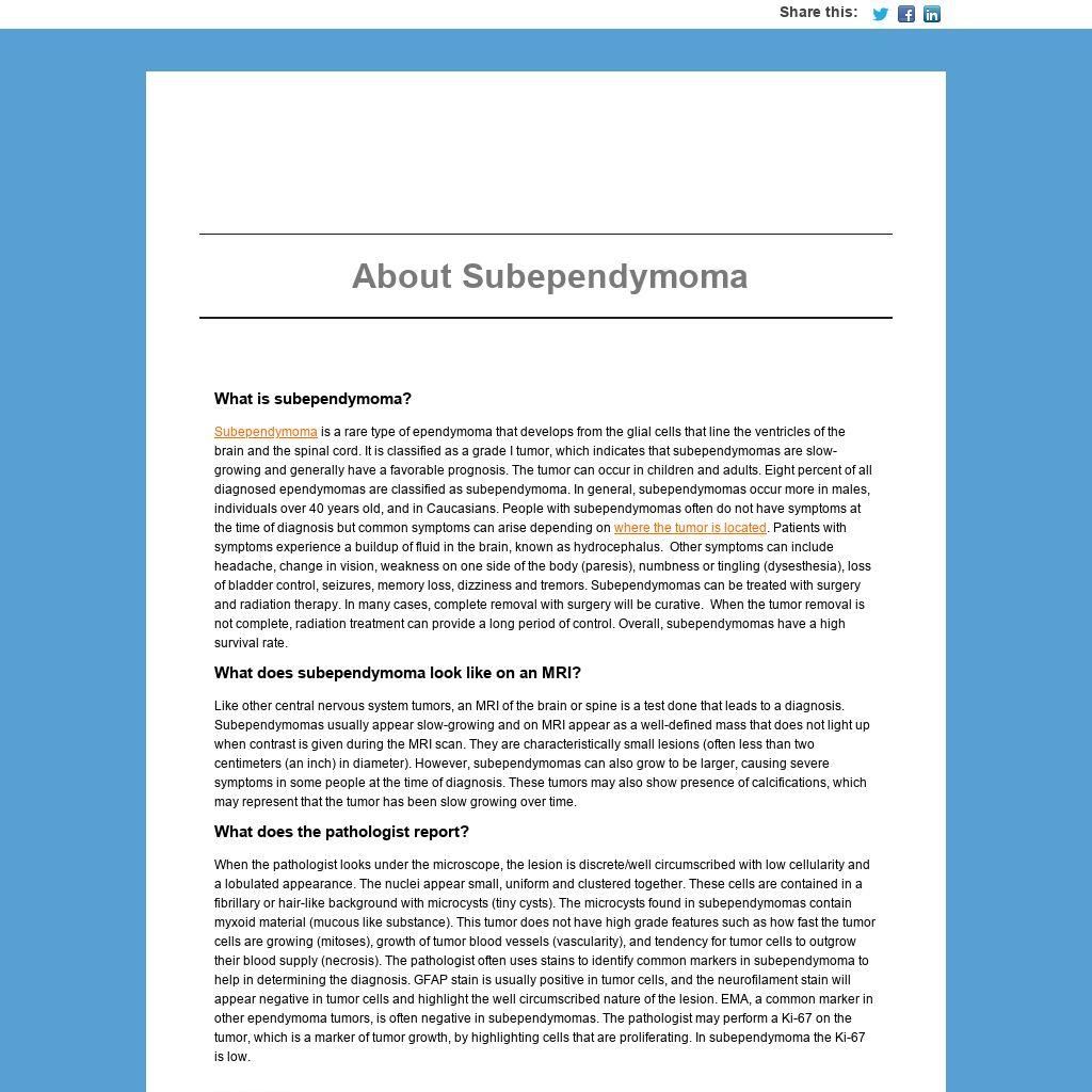 Subependymoma is a rare type of ependymoma that develops from the glial cells that line the ventricles of the brain and the spinal cord. It is classified as a grade I tumor, which indicates that subependymomas are slow-growing and generally have a favorable prognosis. The tumor can occur in children and adults. Eight percent of all diagnosed ependymomas are classified as subependymoma. In general, subependymomas occur more in males, individuals over 40 years old, and in Caucasians. People with subependymomas often do not have symptoms at the time of diagnosis but common symptoms can arise depending on