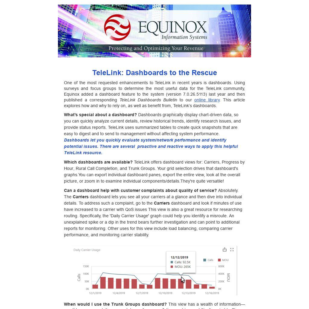 One of the most requested enhancements to TeleLink in recent years is dashboards. Using surveys and focus groups to determine the most useful data for the TeleLink community, Equinox added a dashboard feature to the system (version 7.0.26.5113) last year and then published a corresponding TeleLink Dashboards Bulletin to our online library. This article explores how and why to rely on, as well as benefit from, TeleLink’s dashboards.