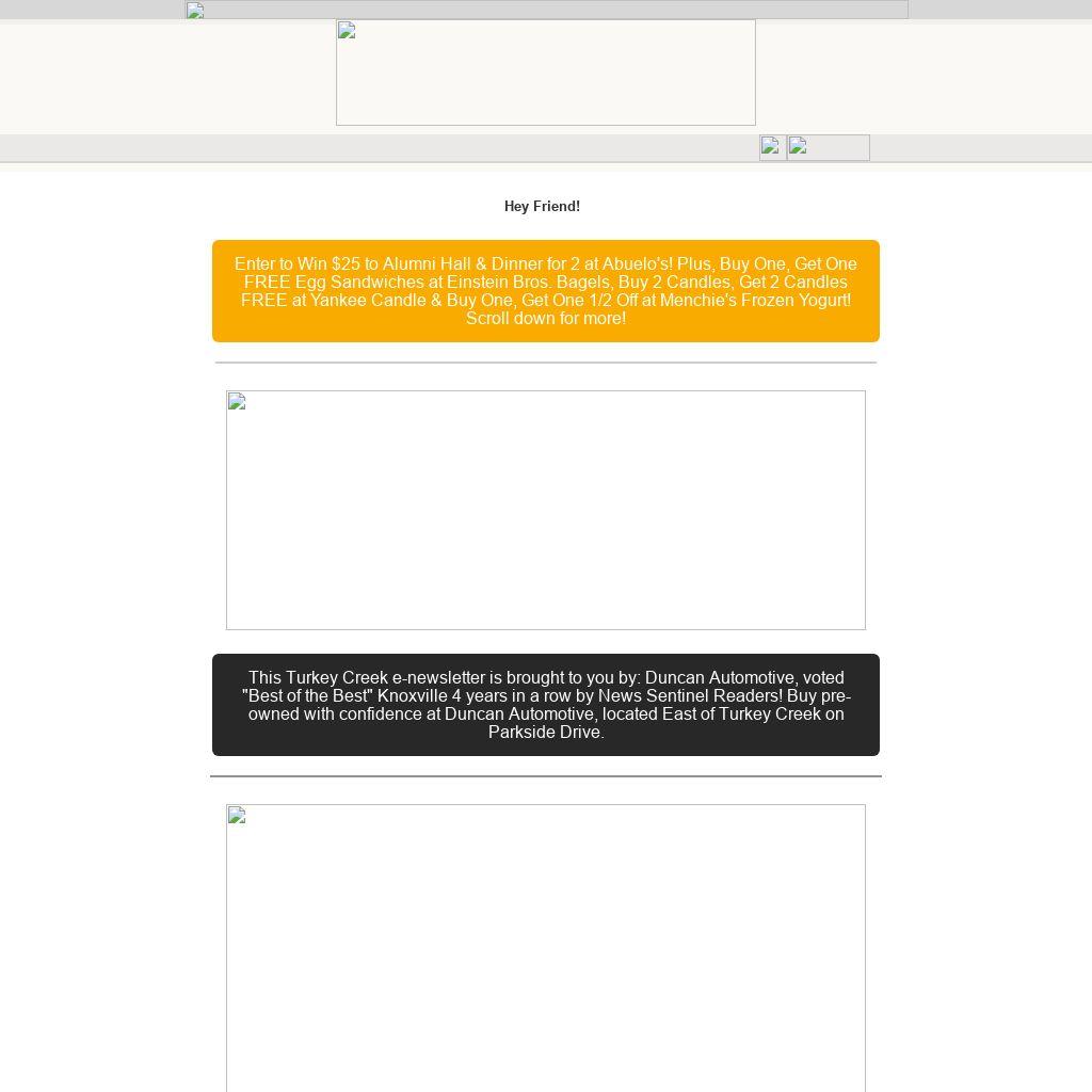 This Turkey Creek e-newsletter is brought to you by: Duncan Automotive, voted "Best of the Best" Knoxville 4 years in a row by News Sentinel Readers! Buy pre-owned with confidence at Duncan Automotive, located East of Turkey Creek on Parkside Drive.
