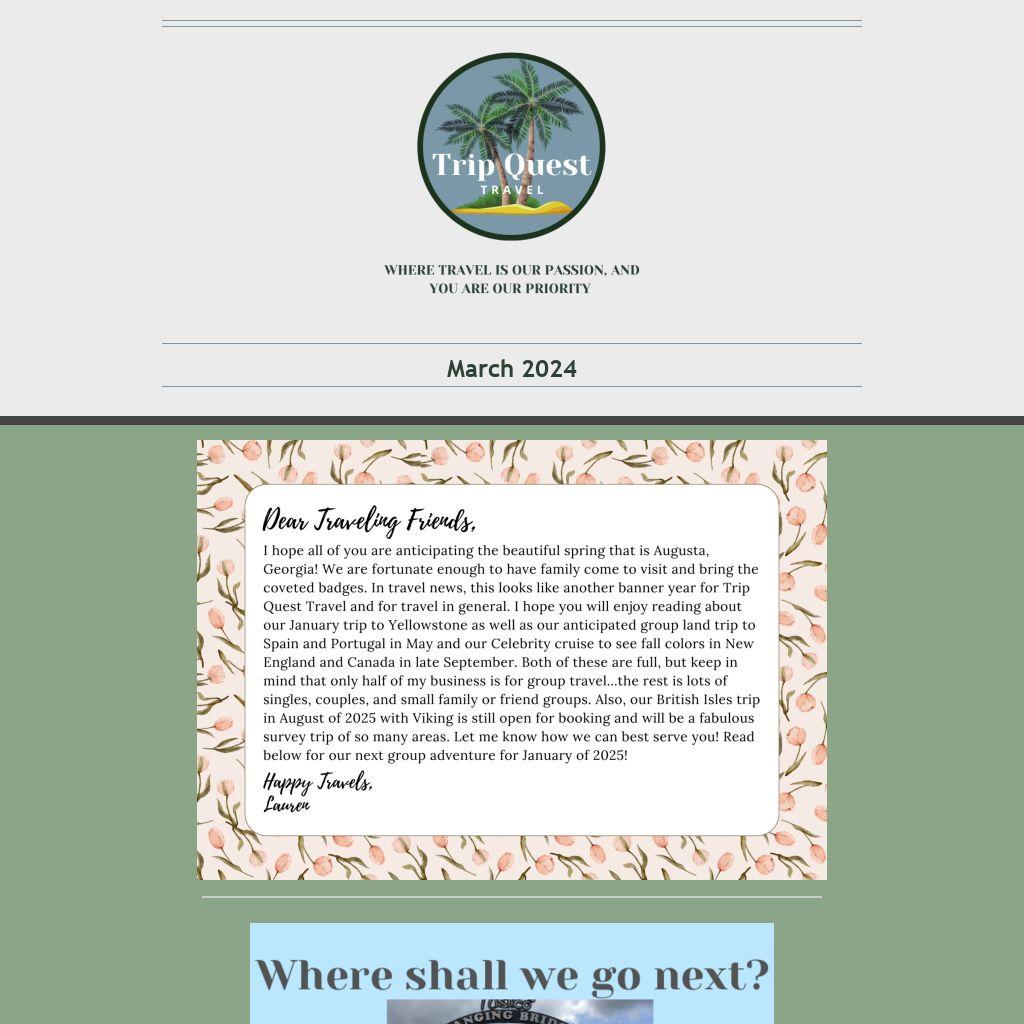 I am Lauren Williams, owner of Trip Quest Travel Services for the past nine years. Moving from three decades in education to becoming a travel consultant has caused me to shift from “The Doctor of Education” to “The Doctor of Travel.” My clients are often just like me – they want a rejuvenating vacation that teaches them about the world and the cultures around them. I love beautiful scenery, exploring new places, and learning something new every day! Aside from travel, I stay busy with my husband, Steve, who has joined me in the travel business, and our four children and thirteen grandchildren. Being active in the church and in our community feeds our souls as well. I love to play pickleball and bridge when I am not helping clients plan that perfect trip! Because our world is so much smaller now, I am happy to work with clients wherever they might live…but by referral only. Let me know if you have friends or family who would like to be added to my monthly newsletter list!  Also, let me know if there is something you’d like to know more about!