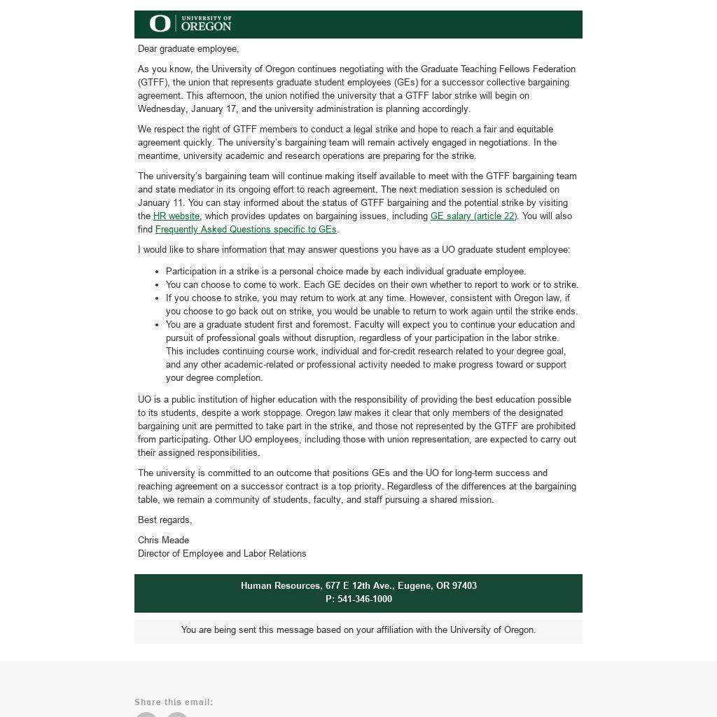 As you know, the University of Oregon continues negotiating with the Graduate Teaching Fellows Federation (GTFF), the union that represents graduate student employees (GEs) for a successor collective bargaining agreement. This afternoon, the union notified the university that a GTFF labor strike will begin on Wednesday, January 17, and the university administration is planning accordingly.