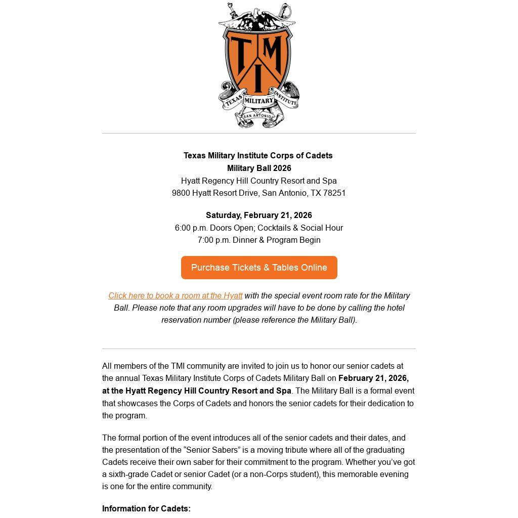 All members of the TMI community are invited to join us to honor our senior cadets at the annual Texas Military Institute Corps of Cadets Military Ball on February 21, 2026, at the Hyatt Regency Hill Country Resort and Spa. The Military Ball is a formal event that showcases the Corps of Cadets and honors the senior cadets for their dedication to the program.