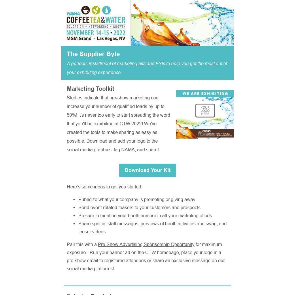 The Supplier Byte A periodic installment of marketing bits and FYIs to help you get the most out of your exhibiting experience.