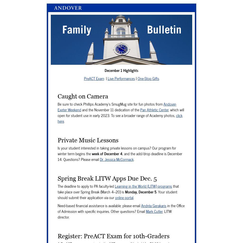 You received this message because you are a valued member of the Andover community. We are obligated to communicate with you, and require you to be on our email list while your student(s) attends Phillips Academy. For more information contact the Dean of Studies Office. |