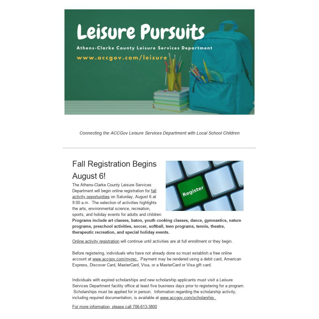 ACCGov Activities and Online RegistrationThe Athens-Clarke County Leisure Services Department offers a diverse selection of activities highlighting the arts, environmental science, recreation, sports, and holiday events for adults and children. All registration takes place online at www.accgov.com/myrec
