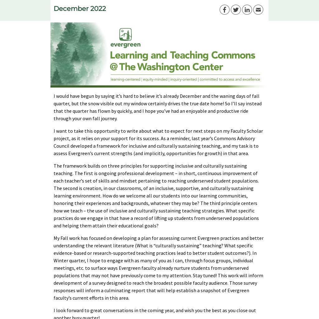 I want to take this opportunity to write about what to expect for next steps on my Faculty Scholar project, as it relies on your support for its success. As a reminder, last year’s Commons Advisory Council developed a framework for inclusive and culturally sustaining teaching, and my task is to assess Evergreen’s current strengths (and implicitly, opportunities for growth) in that area.
