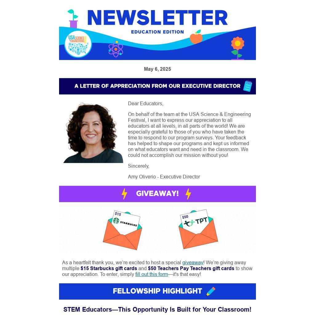 On behalf of the team at the USA Science & Engineering Festival, I want to express our appreciation to all educators at all levels, in all parts of the world! We are especially grateful to those of you who have taken the time to respond to our program surveys. Your feedback has helped to shape our programs and kept us informed on what educators want and need in the classroom. We could not accomplish our mission without you!