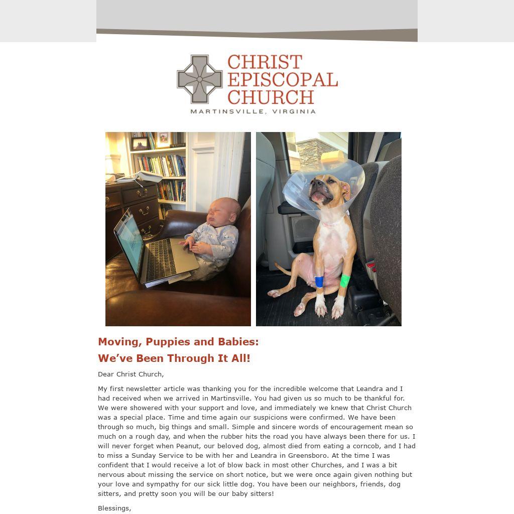 My first newsletter article was thanking you for the incredible welcome that Leandra and I had received when we arrived in Martinsville. You had given us so much to be thankful for. We were showered with your support and love, and immediately we knew that Christ Church was a special place. Time and time again our suspicions were confirmed. We have been through so much, big things and small. Simple and sincere words of encouragement mean so much on a rough day, and when the rubber hits the road you have always been there for us. I will never forget when Peanut, our beloved dog, almost died from eating a corncob, and I had to miss a Sunday Service to be with her and Leandra in Greensboro. At the time I was confident that I would receive a lot of blow back in most other Churches, and I was a bit nervous about missing the service on short notice, but we were once again given nothing but your love and sympathy for our sick little dog. You have been our neighbors, friends, dog sitters, and pretty soon you will be our baby sitters!