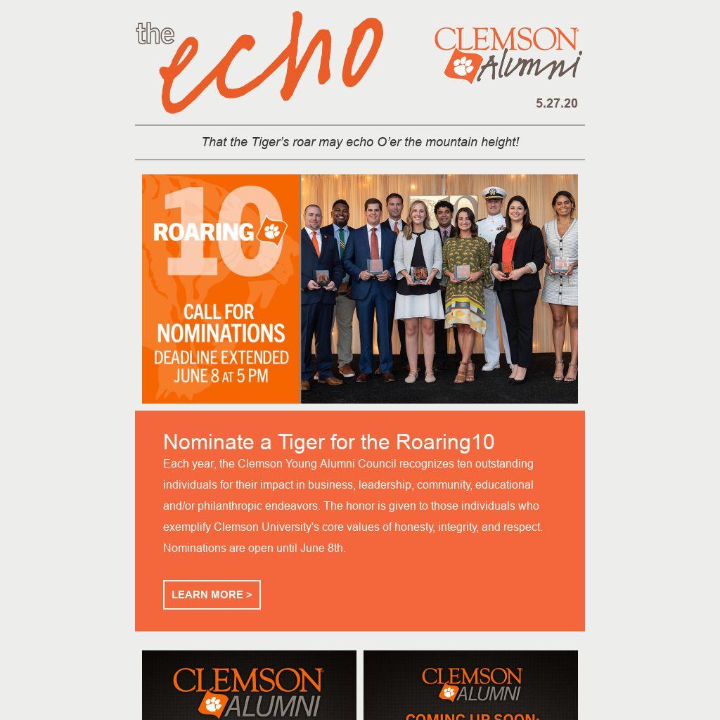 Each year, the Clemson Young Alumni Council recognizes ten outstanding individuals for their impact in business, leadership, community, educational and/or philanthropic endeavors. The honor is given to those individuals who exemplify Clemson University's core values of honesty, integrity, and respect. Nominations are open until June 8th.