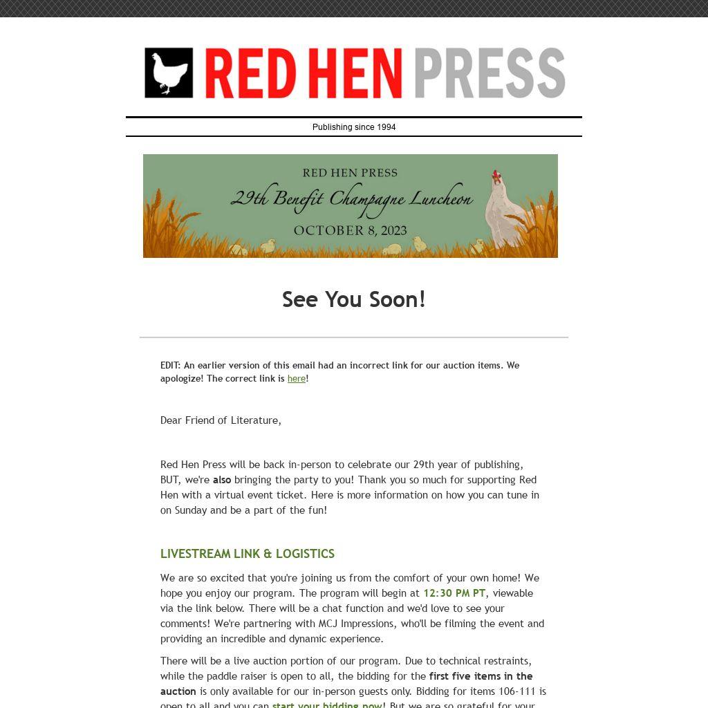 Red Hen Press will be back in-person to celebrate our 29th year of publishing, BUT, we're also bringing the party to you! Thank you so much for supporting Red Hen with a virtual event ticket. Here is more information on how you can tune in on Sunday and be a part of the fun!