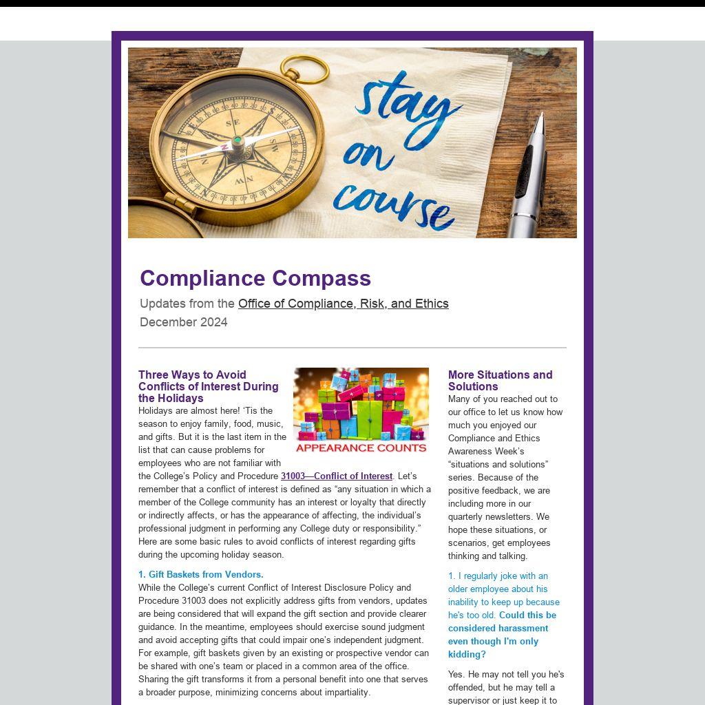 Holidays are almost here! ‘Tis the season to enjoy family, food, music, and gifts. But it is the last item in the list that can cause problems for employees who are not familiar with the College’s Policy and Procedure 31003—Conflict of Interest. Let’s remember that a conflict of interest is defined as “any situation in which a member of the College community has an interest or loyalty that directly or indirectly affects, or has the appearance of affecting, the individual’s professional judgment in performing any College duty or responsibility.” Here are some basic rules to avoid conflicts of interest regarding gifts during the upcoming holiday season.