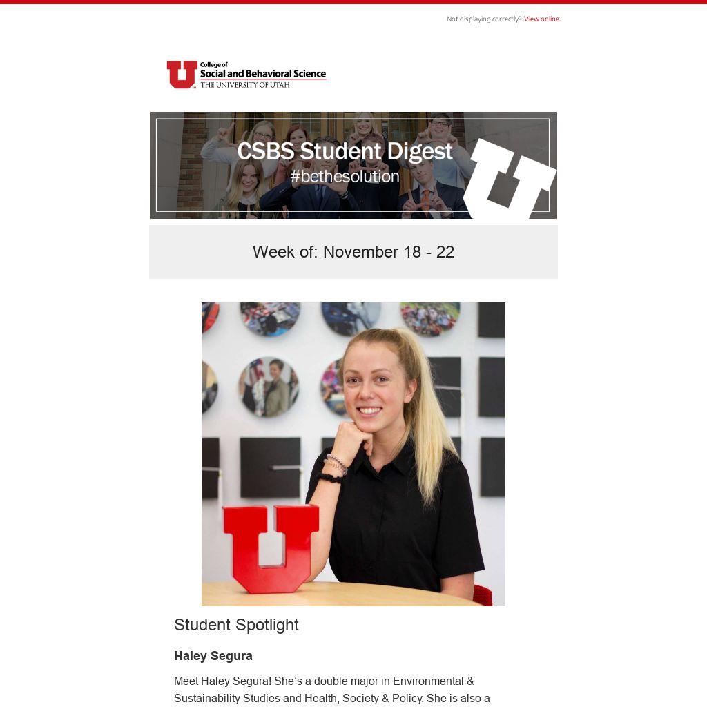 Meet Haley Segura! She’s a double major in Environmental & Sustainability Studies and Health, Society & Policy. She is also a Solutions Scholar. "I'm a Utah native who loves spending time outdoors. I'm lucky to have the Wasatch mountains in my backyard because it's a giant playground, and I try to spend my free time hiking, skiing, or hammocking there. This summer I plan on working, traveling, and working on Erin Mendenhall's mayoral campaign. I chose Health Society and Policy (HSP) because it is a multidisciplinary major focusing on human health, which is something I have always been drawn to. The major is diverse and people come from various backgrounds and have different opinions, and we must address issues from different perspectives."