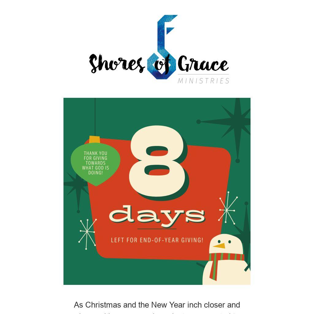 As Christmas and the New Year inch closer and closer with every passing minute, we wanted to take a moment to remind you that there are only 8 days left for end-of-year giving for 2021! Shores of Grace Ministries is a 501(c)3 organization, meaning donations to us are tax-deductible!