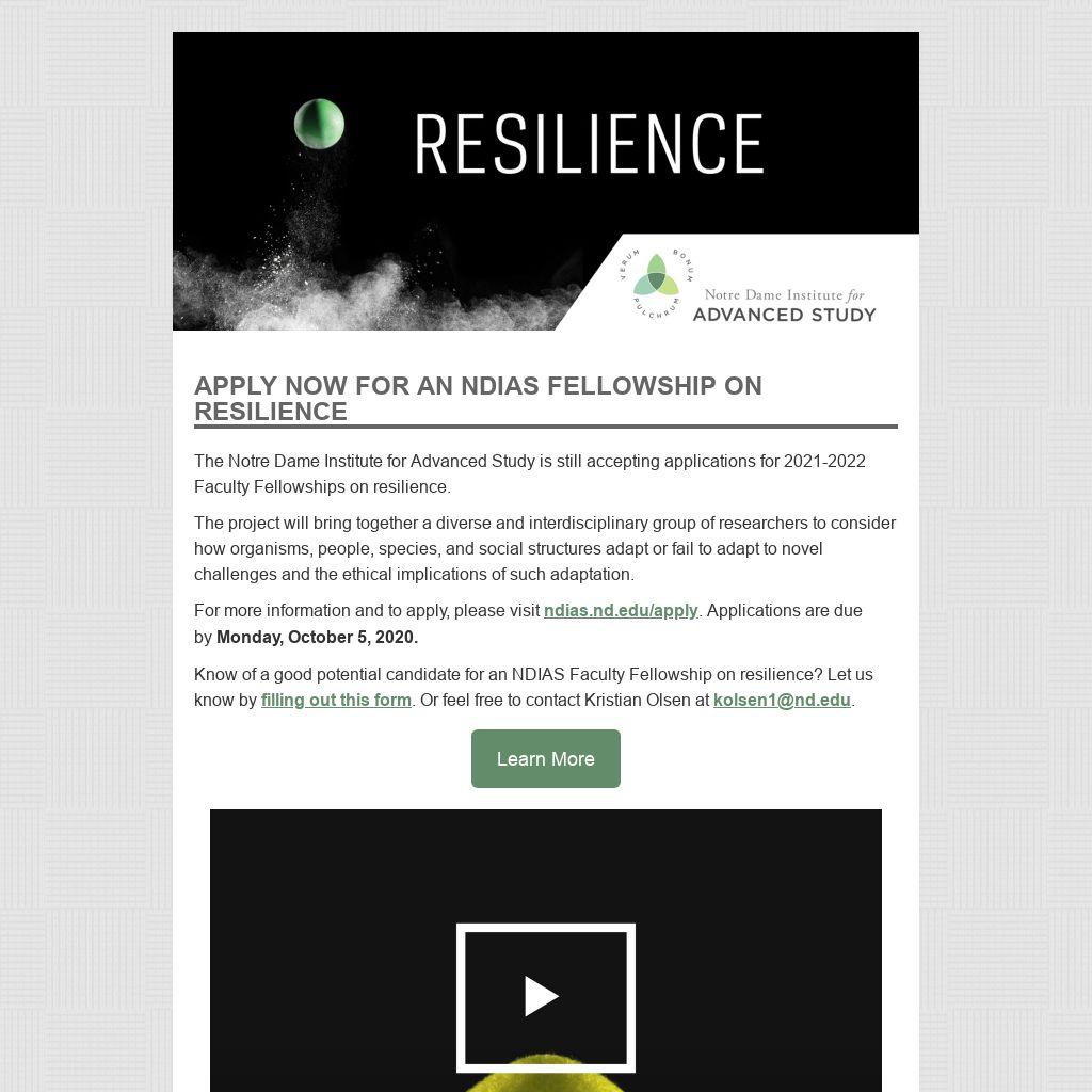 The Notre Dame Institute for Advanced Study is still accepting applications for 2021-2022 Faculty Fellowships on resilience.