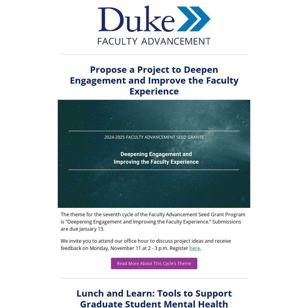 The theme for the seventh cycle of the Faculty Advancement Seed Grant Program is “Deepening Engagement and Improving the Faculty Experience.” Submissions are due January 13.