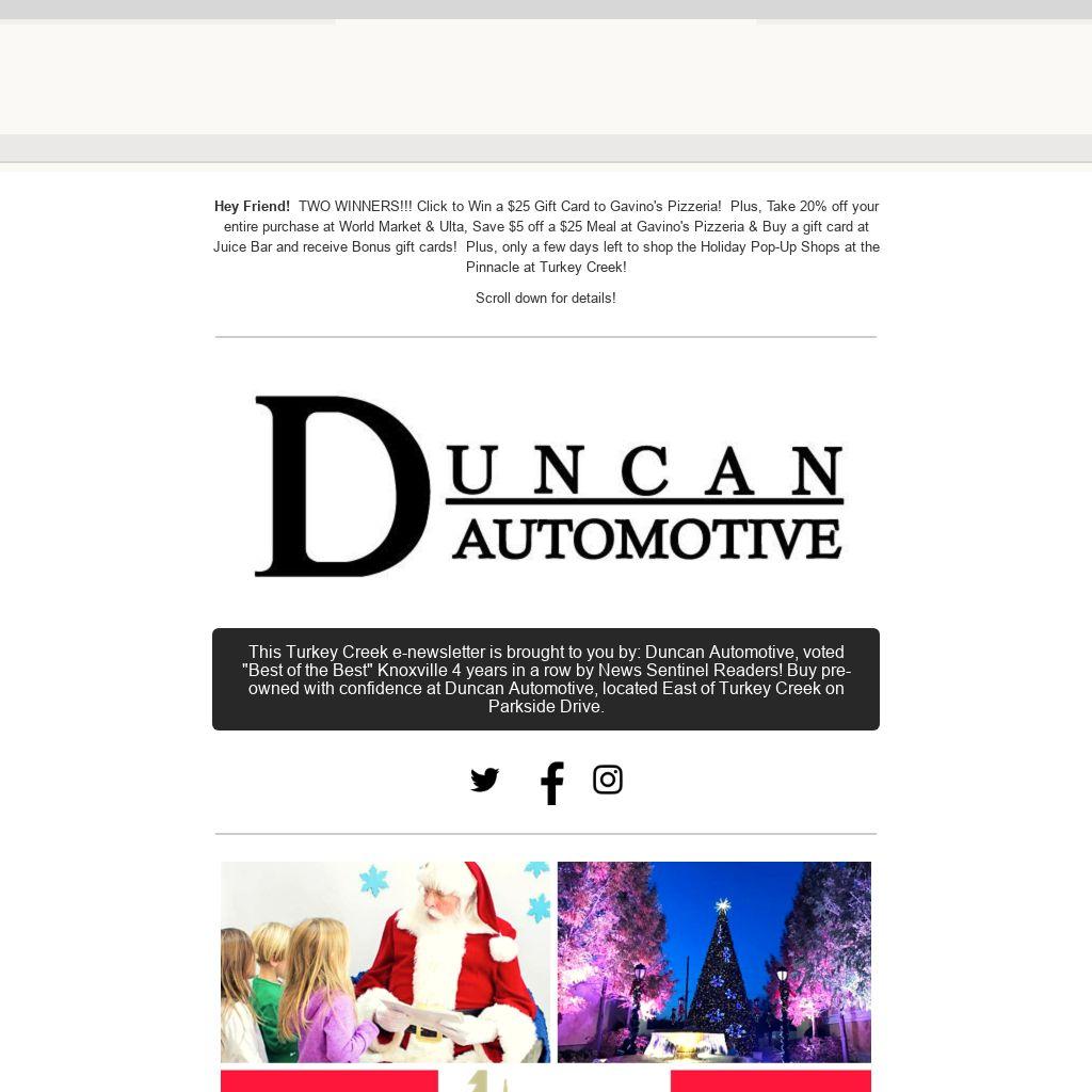 Hey Friend! TWO WINNERS!!! Click to Win a $25 Gift Card to Gavino's Pizzeria! Plus, Take 20% off your entire purchase at World Market & Ulta, Save $5 off a $25 Meal at Gavino's Pizzeria & Buy a gift card at Juice Bar and receive Bonus gift cards! Plus, only a few days left to shop the Holiday Pop-Up Shops at the Pinnacle at Turkey Creek!