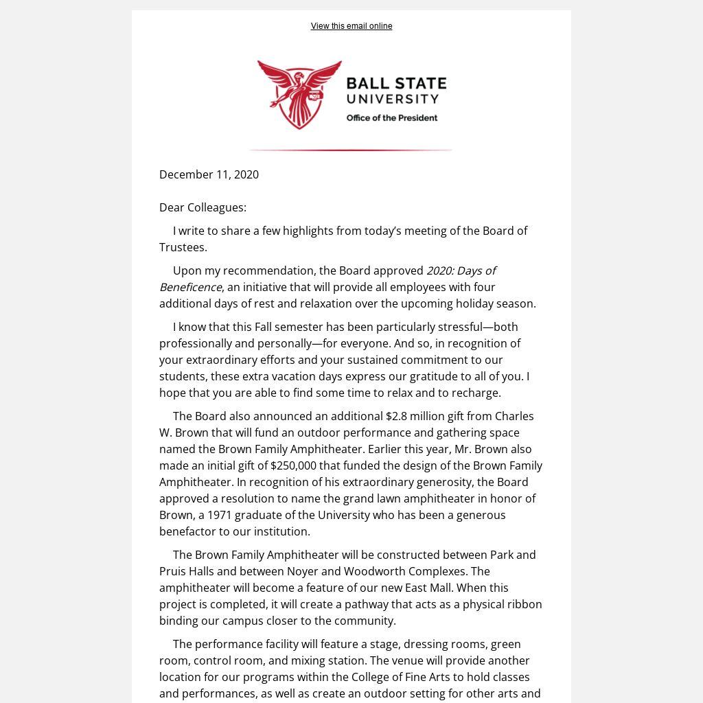The Board also announced an additional $2.8 million gift from Charles W. Brown that will fund an outdoor performance and gathering space named the Brown Family Amphitheater. Earlier this year, Mr. Brown also made an initial gift of $250,000 that funded the design of the Brown Family Amphitheater. In recognition of his extraordinary generosity, the Board approved a resolution to name the grand lawn amphitheater in honor of Brown, a 1971 graduate of the University who has been a generous benefactor to our institution.