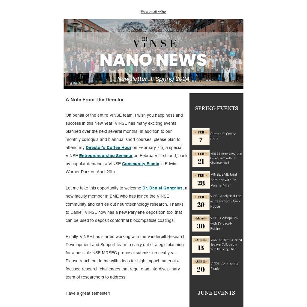 | On behalf of the entire VINSE team, I wish you happiness and success in this New Year. VINSE has many exciting events planned over the next several months. In addition to our monthly colloquia and biannual short courses, please plan to attend my Director’s Coffee Hour on February 7th, a special VINSE Entrepreneurship Seminar on February 21st, and, back by popular demand, a VINSE Community Picnic in Edwin Warner Park on April 20th.