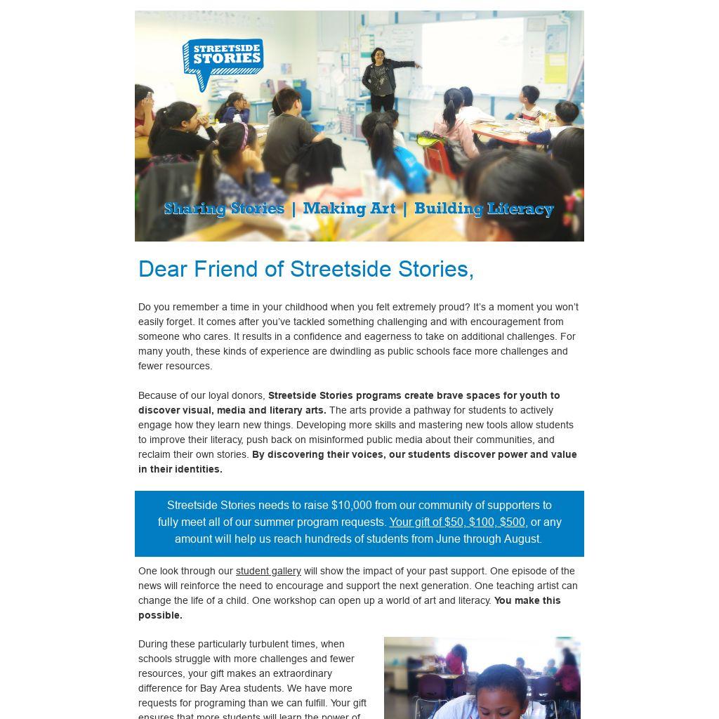 Because of our loyal donors, Streetside Stories programs create brave spaces for youth to discover visual, media and literary arts. The arts provide a pathway for students to actively engage how they learn new things. Developing more skills and mastering new tools allow students to improve their literacy, push back on misinformed public media about their communities, and reclaim their own stories. By discovering their voices, our students discover power and value in their identities.