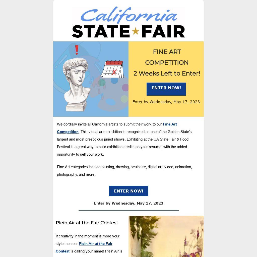 We cordially invite all California artists to submit their work to our Fine Art Competition. This visual arts exhibition is recognized as one of the Golden State's largest and most prestigious juried shows. Exhibiting at the CA State Fair & Food Festival is a great way to build exhibition credits on your resume, with the added opportunity to sell your work.
