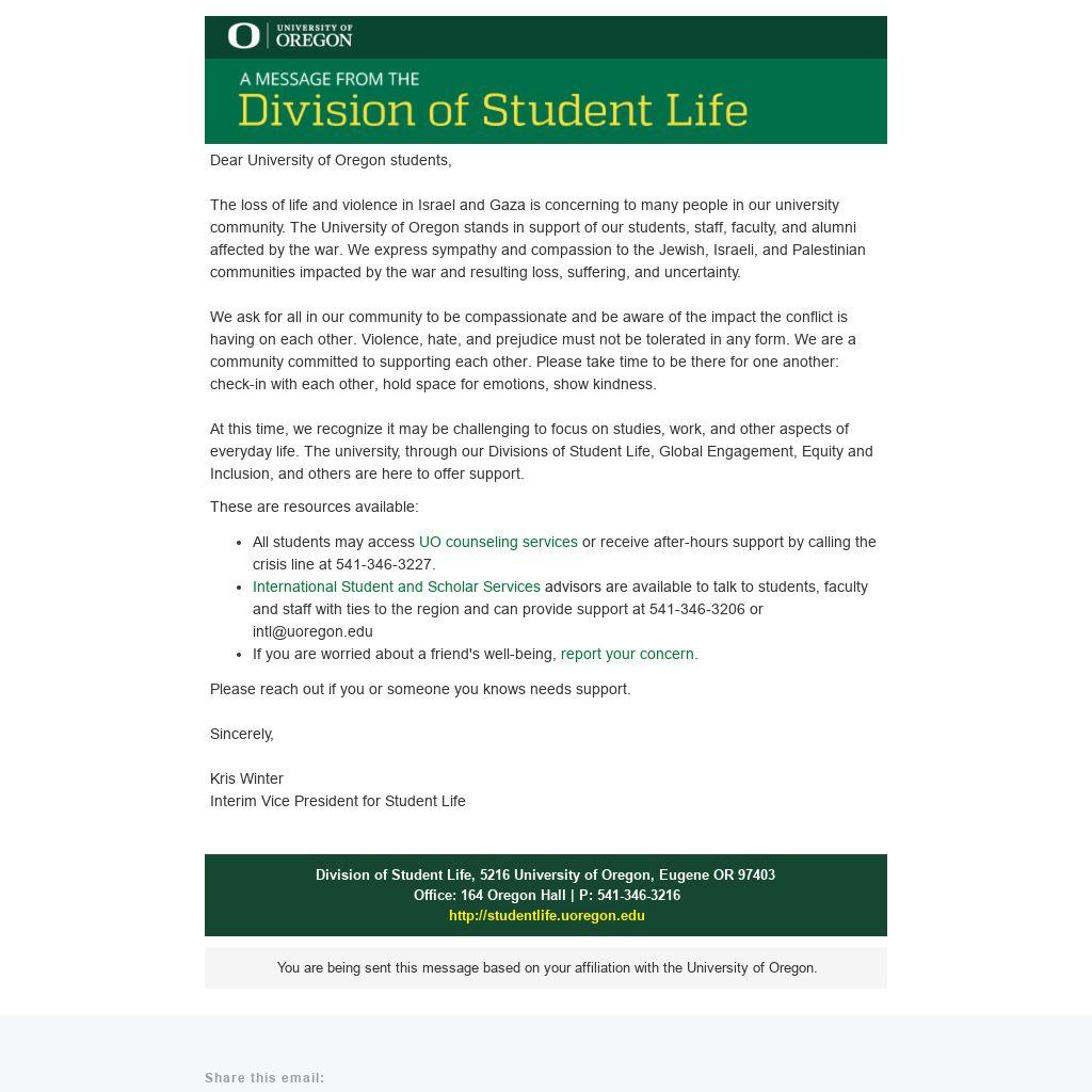 The loss of life and violence in Israel and Gaza is concerning to many people in our university community. The University of Oregon stands in support of our students, staff, faculty, and alumni affected by the war. We express sympathy and compassion to the Jewish, Israeli, and Palestinian communities impacted by the war and resulting loss, suffering, and uncertainty.