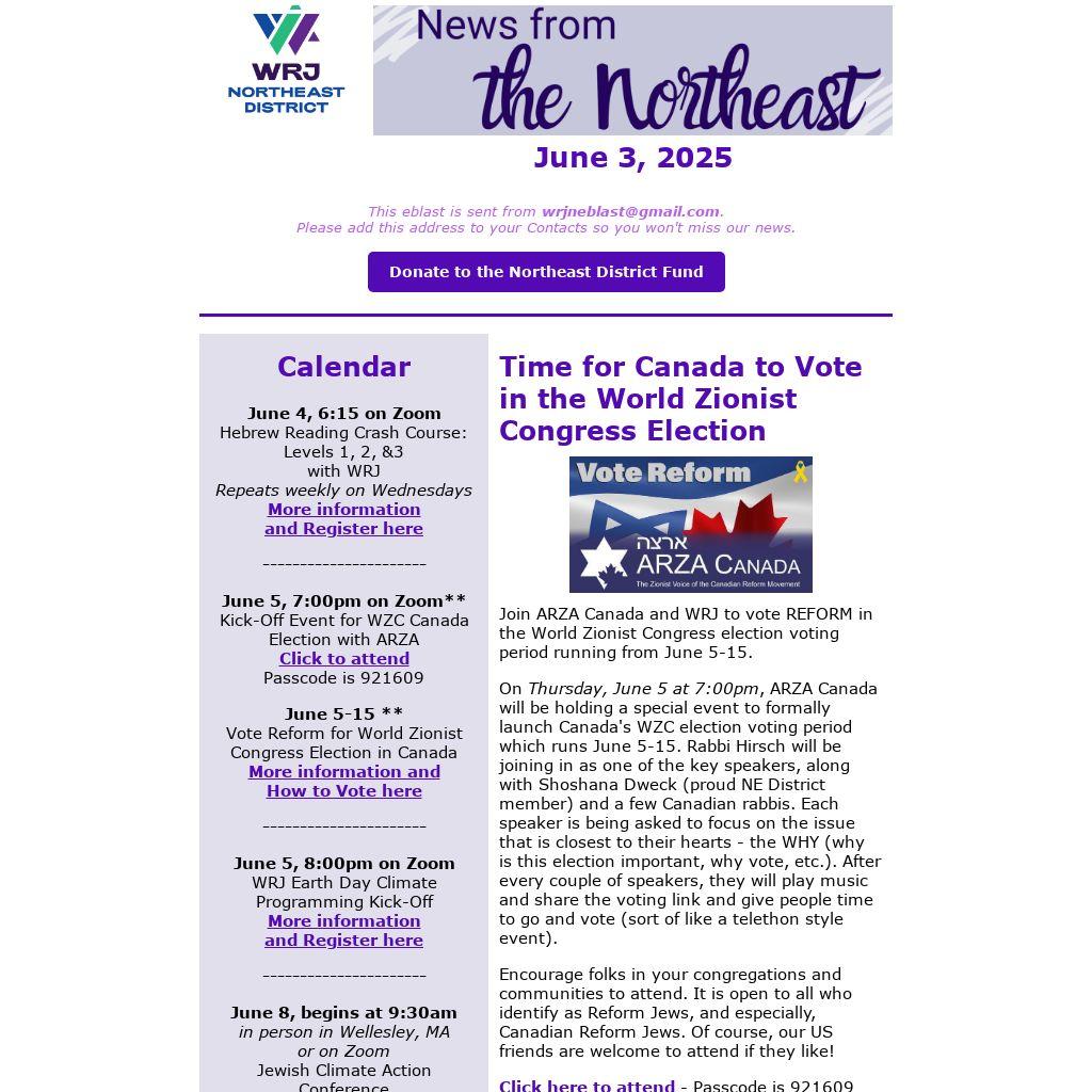 On Thursday, June 5 at 7:00pm, ARZA Canada will be holding a special event to formally launch Canada's WZC election voting period which runs June 5-15. Rabbi Hirsch will be joining in as one of the key speakers, along with Shoshana Dweck (proud NE District member) and a few Canadian rabbis. Each speaker is being asked to focus on the issue that is closest to their hearts - the WHY (why is this election important, why vote, etc.). After every couple of speakers, they will play music and share the voting link and give people time to go and vote (sort of like a telethon style event).