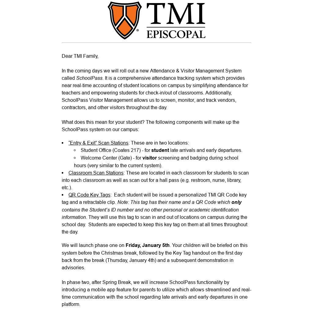 In the coming days we will roll out a new Attendance & Visitor Management System called SchoolPass. It is a comprehensive attendance tracking system which provides near real-time accounting of student locations on campus by simplifying attendance for teachers and empowering students for check-in/out of classrooms. Additionally, SchoolPass Visitor Management allows us to screen, monitor, and track vendors, contractors, and other visitors throughout the day.