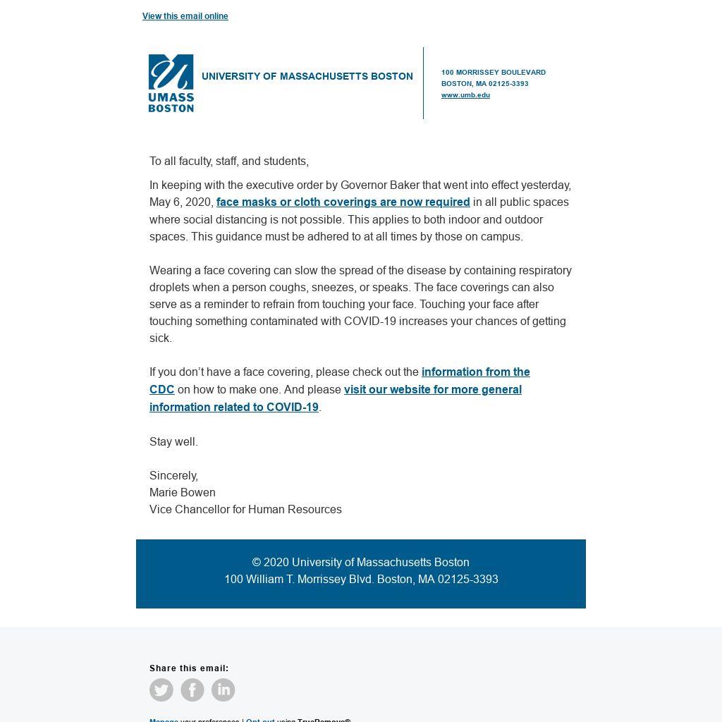 In keeping with the executive order by Governor Baker that went into effect yesterday, May 6, 2020, face masks or cloth coverings are now required in all public spaces where social distancing is not possible. This applies to both indoor and outdoor spaces. This guidance must be adhered to at all times by those on campus.