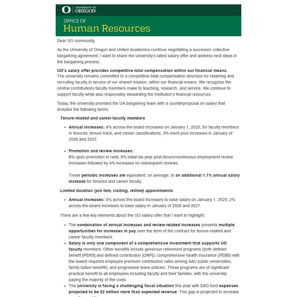 As the University of Oregon and United Academics continue negotiating a successor collective bargaining agreement, I want to share the university’s latest salary offer and address next steps in the bargaining process.