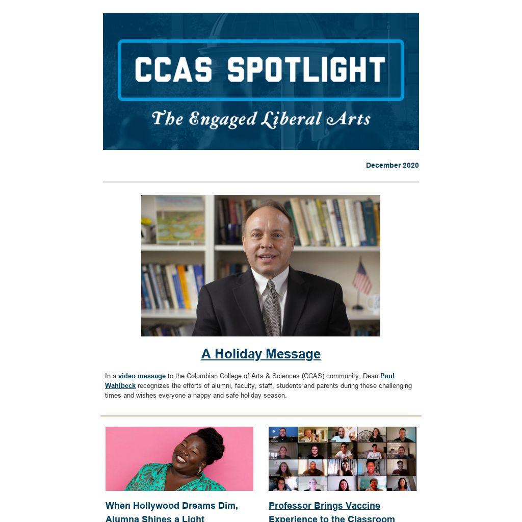 In a video message to the Columbian College of Arts & Sciences (CCAS) community, Dean Paul Wahlbeck recognizes the efforts of alumni, faculty, staff, students and parents during these challenging times and wishes everyone a happy and safe holiday season.
