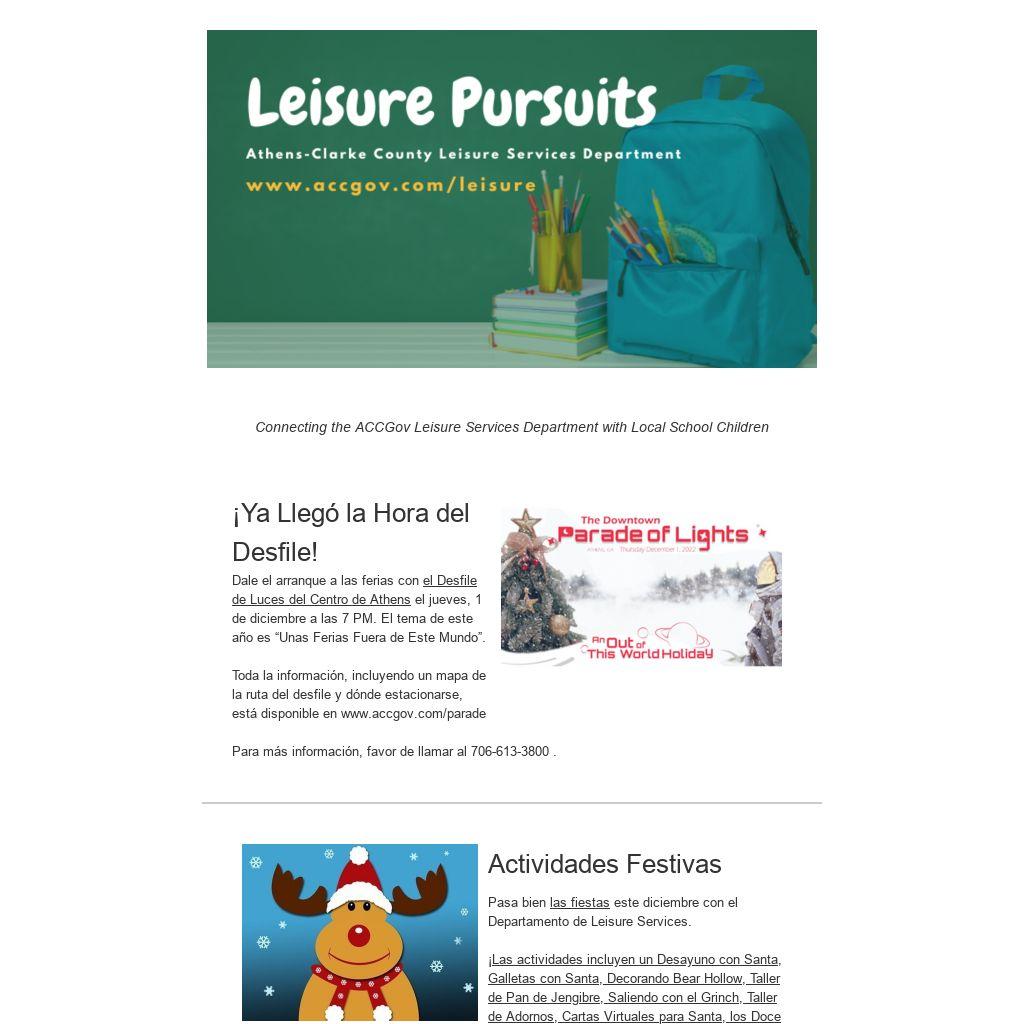 El Departamento de Leisure Services de Athens-Clarke County ofrece una selección diversa de actividades, incluyendo las artes, las ciencias ambientales, la recreación, deportes y eventos de días feriados para adultos y niños. Todas las inscripciones se hacen en línea en t www.accgov.com/myrec