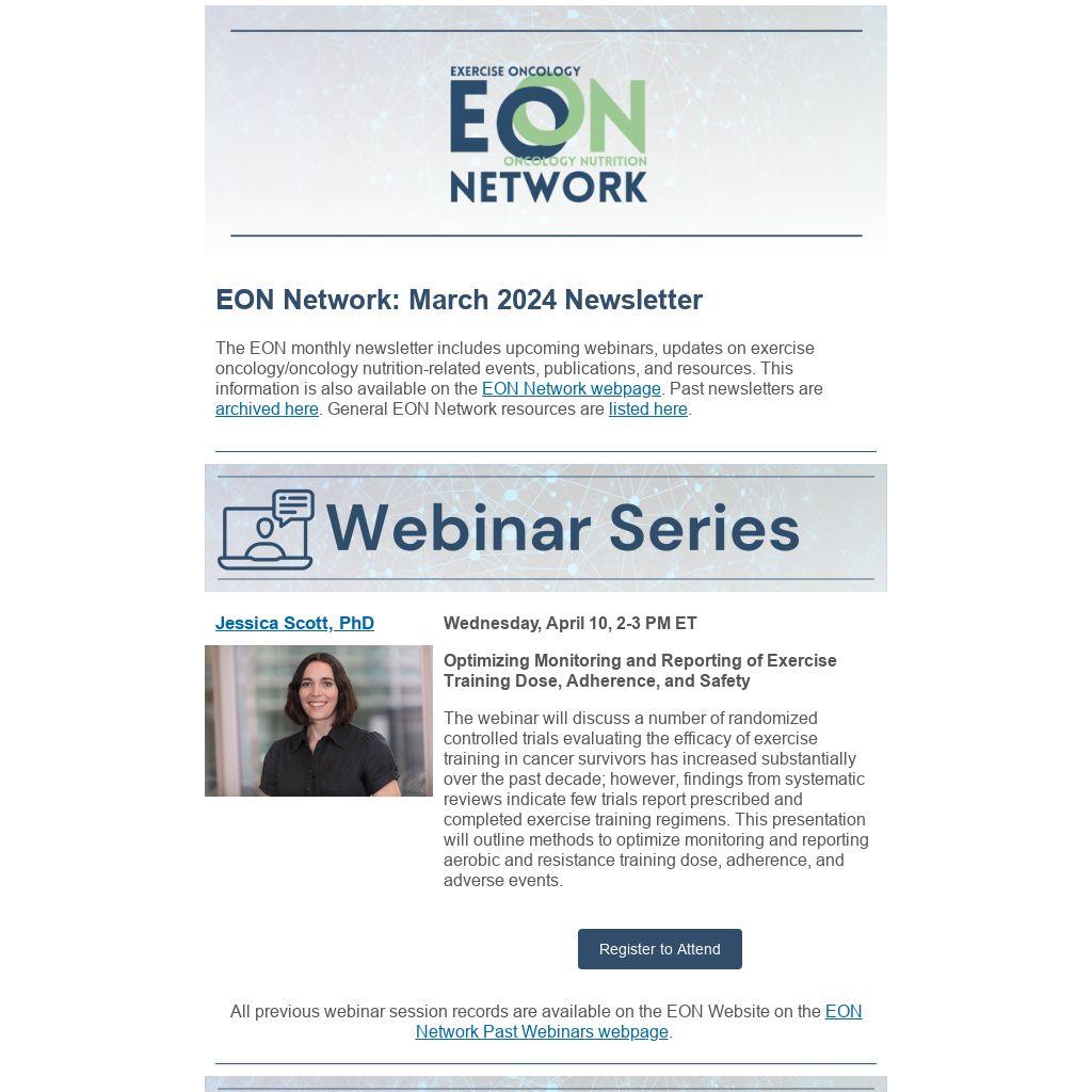 The EON monthly newsletter includes upcoming webinars, updates on exercise oncology/oncology nutrition-related events, publications, and resources. This information is also available on the EON Network webpage. Past newsletters are archived here. General EON Network resources are listed here.