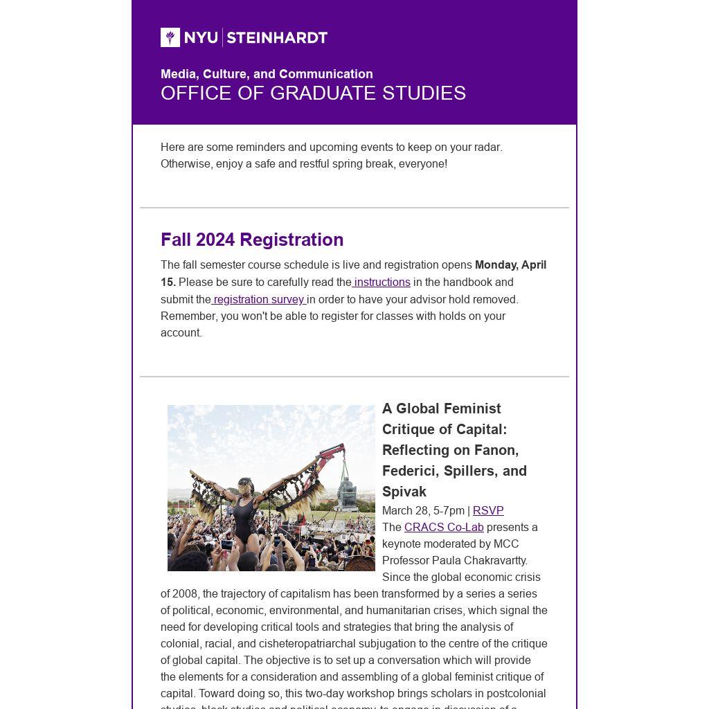 The fall semester course schedule is live and registration opens Monday, April 15. Please be sure to carefully read the instructions in the handbook and submit the registration survey in order to have your advisor hold removed. Remember, you won't be able to register for classes with holds on your account.