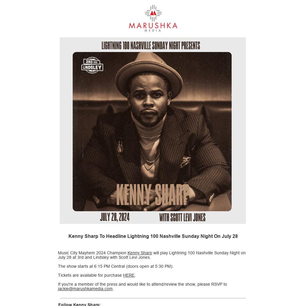 | | Kenny Sharp To Headline Lightning 100 Nashville Sunday Night On July 28