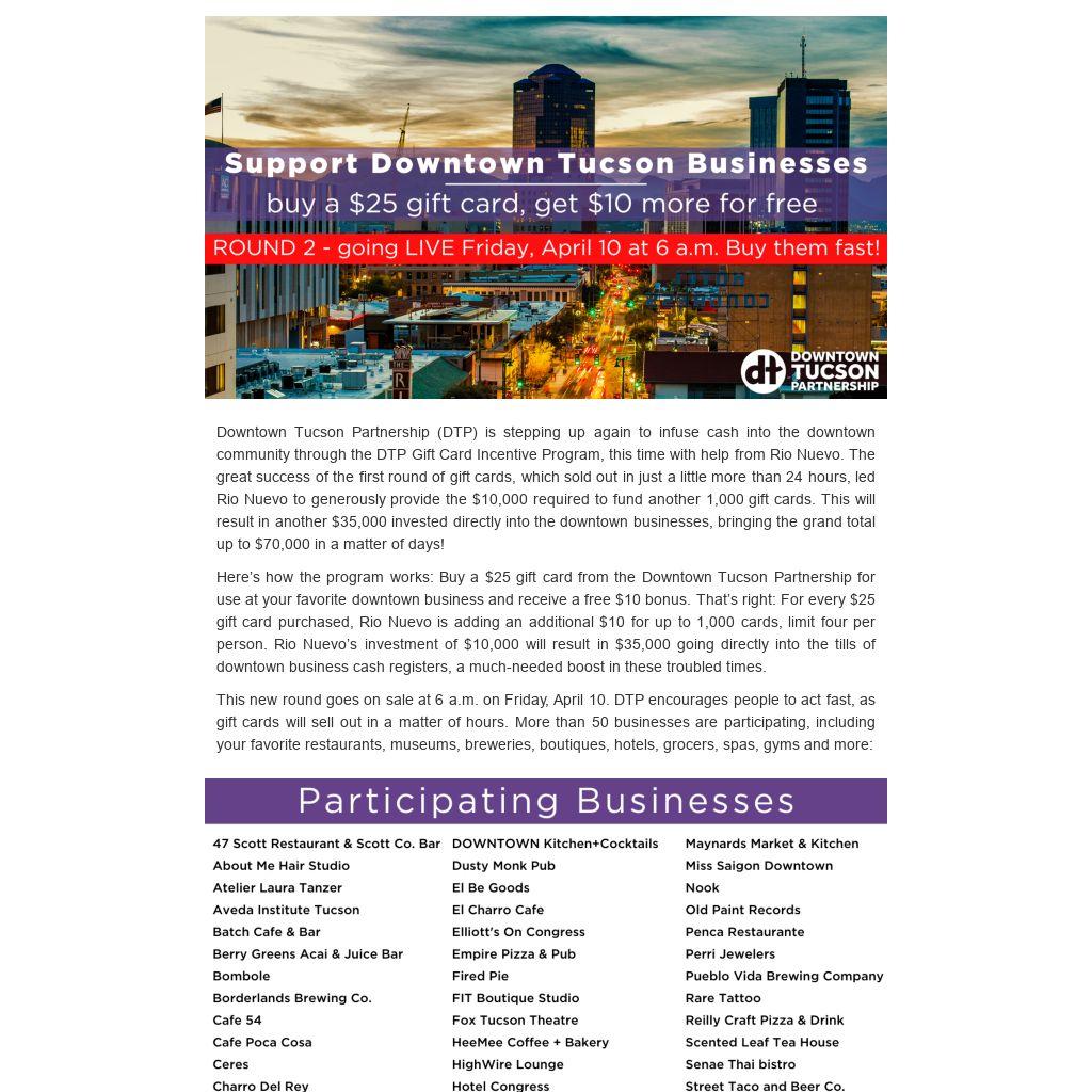 Here’s how the program works: Buy a $25 gift card from the Downtown Tucson Partnership for use at your favorite downtown business and receive a free $10 bonus. That’s right: For every $25 gift card purchased, Rio Nuevo is adding an additional $10 for up to 1,000 cards, limit four per person. Rio Nuevo’s investment of $10,000 will result in $35,000 going directly into the tills of downtown business cash registers, a much-needed boost in these troubled times.