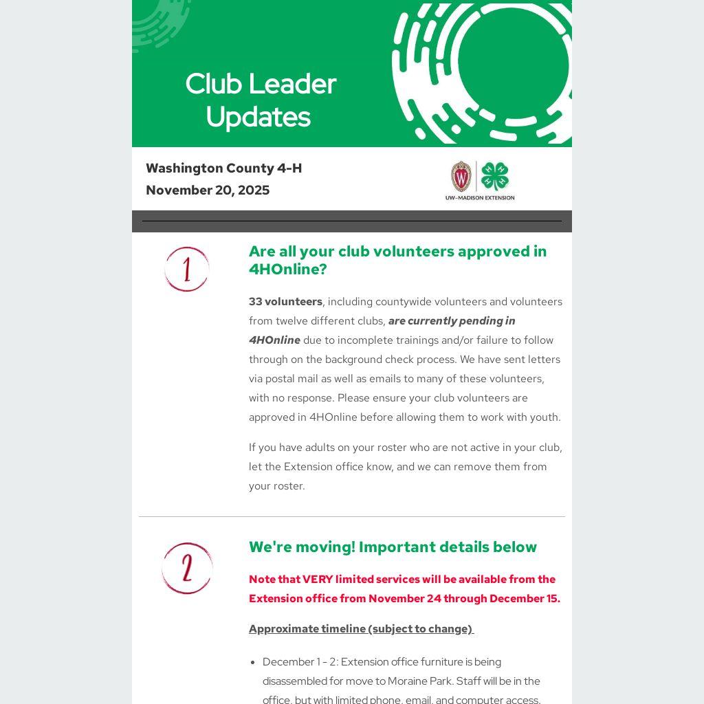 If you have adults on your roster who are not active in your club, let the Extension office know, and we can remove them from your roster.