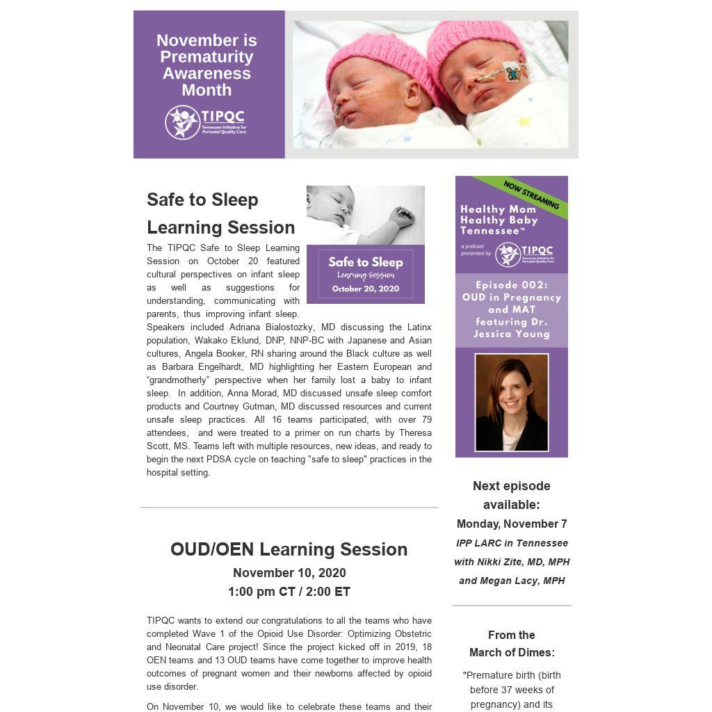 The TIPQC Safe to Sleep Learning Session on October 20 featured cultural perspectives on infant sleep as well as suggestions for understanding, communicating with parents, thus improving infant sleep. Speakers included Adriana Bialostozky, MD discussing the Latinx population, Wakako Eklund, DNP, NNP-BC with Japanese and Asian cultures, Angela Booker, RN sharing around the Black culture as well as Barbara Engelhardt, MD highlighting her Eastern European and “grandmotherly” perspective when her family lost a baby to infant sleep. In addition, Anna Morad, MD discussed unsafe sleep comfort products and Courtney Gutman, MD discussed resources and current unsafe sleep practices. All 16 teams participated, with over 79 attendees, and were treated to a primer on run charts by Theresa Scott, MS. Teams left with multiple resources, new ideas, and ready to begin the next PDSA cycle on teaching "safe to sleep" practices in the hospital setting.