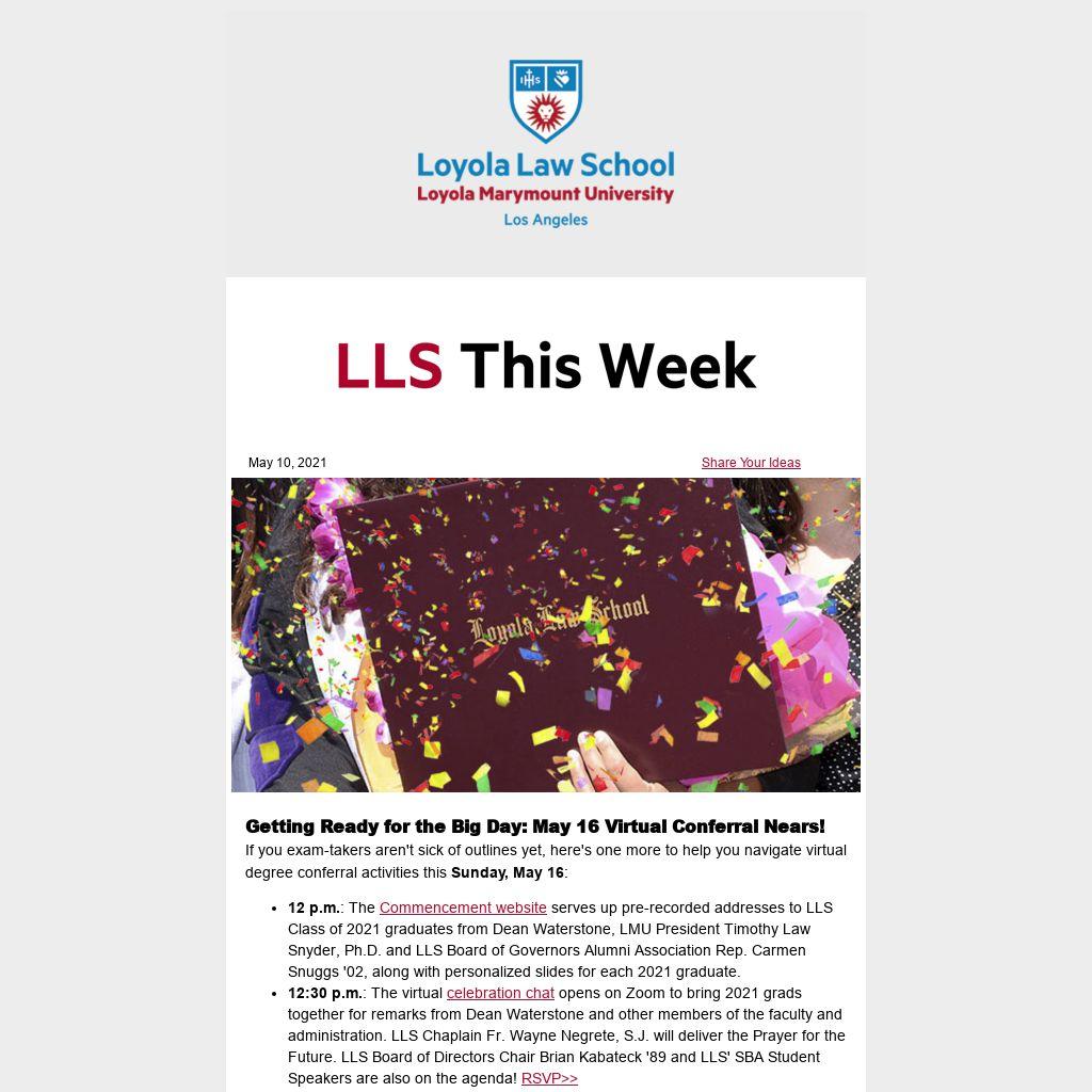 - Don't forget: Visit the LLS Commencement website for tools to celebrate the big day. If you are hosting a virtual celebration for 2021 grads on or around May 16, please email us so we can promote!